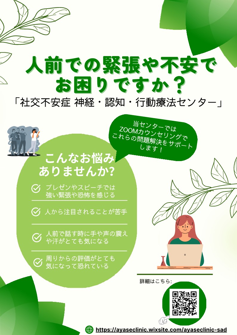 *R5年11月より、『社交不安症 神経・認知・行動療法センター』を運営しています。社交不安症のオンライン・カウンセリングを希望される方は、こちらの方が予約が入りやすいので「認知行動療法によるカウンセリングのご案内」のページからお申込み下さい。